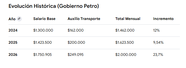 Si se considera el ingreso total (incluyendo el auxilio de transporte), este pasó de $1.117.172 en 2022 a $2.000.000 para 2026, lo que representa un aumento global del 79% a quienes ganan el mínimo