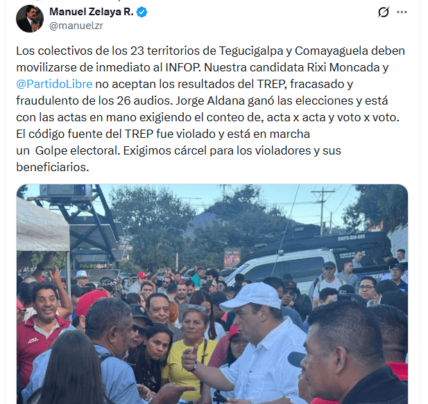Regeneración 9 de diciembre 025– El gobernante Partido Libertad y Refundación (Libre) en Honduras anunció en la noche del domingo que no reconoce los resultados de las elecciones presidenciales del pasado 30 de noviembre, cuyos resultados aún se encuentran en escrutinio.