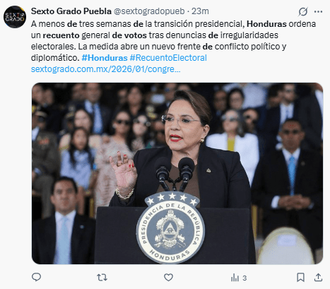 Regeneración, 12 de enero 2026– La presidenta hondureña, Xiomara Castro, dio a conocer el viernes un decreto que fue aprobado por el Congreso, el cual demanda un recuento de los votos tras las elecciones, a solo 17 días del cambio de Gobierno en este país de Centroamérica.