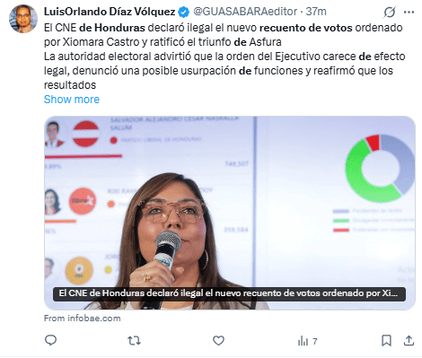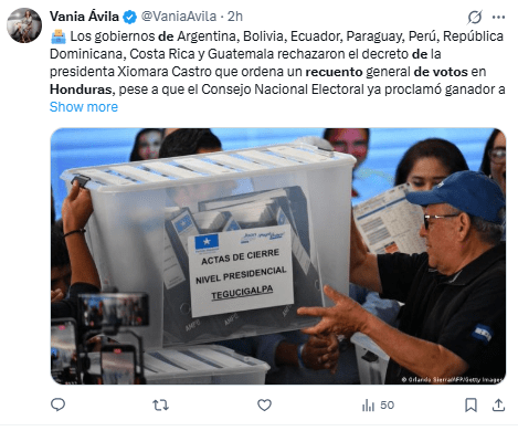 Dejando constancia de mi apego irrestricto a la voluntad del votante y a la soberanía de Honduras; y que respeto la alterabilidad en el ejercicio de la presidencia”, agregó.
