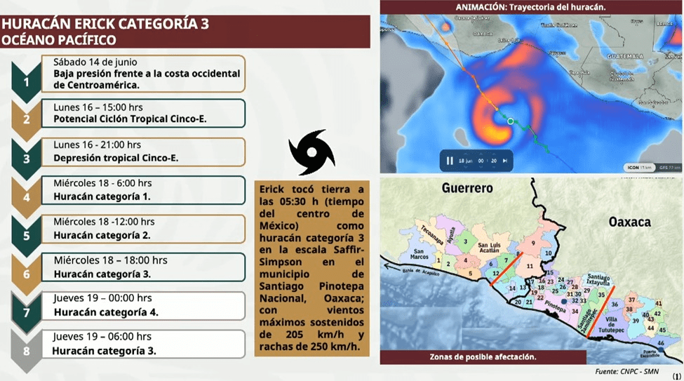 La Presidenta Sheinbaum informó que el huracán Erick tocó tierra en categoría 3, entre las 5:00 y 6:00 horas, de este jueves.