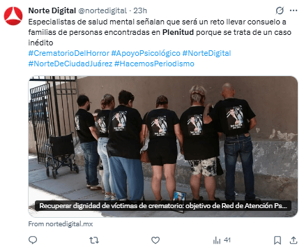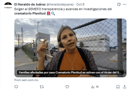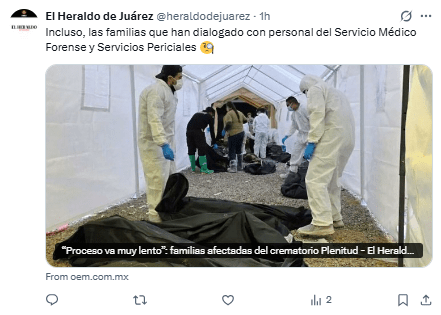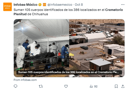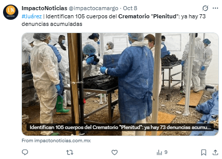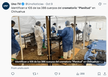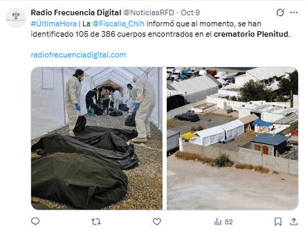 Regeneración, 10 de octubre 2025– La Fiscalía General del Estado (FGE) de Chihuahua informó que han sido identificados 105 cuerpos de un total de 386 hallados en el crematorio “Plenitud”, ubicado en Ciudad Juárez.