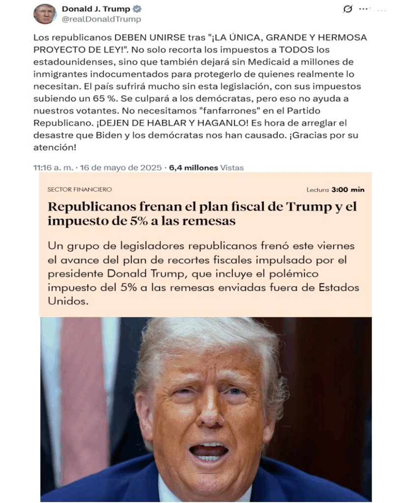 Regeneración, 16 de mayo de 2025. La Presidenta Claudia Sheinbaum Pardo aseguró que la propuesta de imponer un impuesto del 5 por ciento a las remesas, como lo proponen congresistas republicanos en la Cámara de Representantes de EE.UU, es un acto discriminatorio.