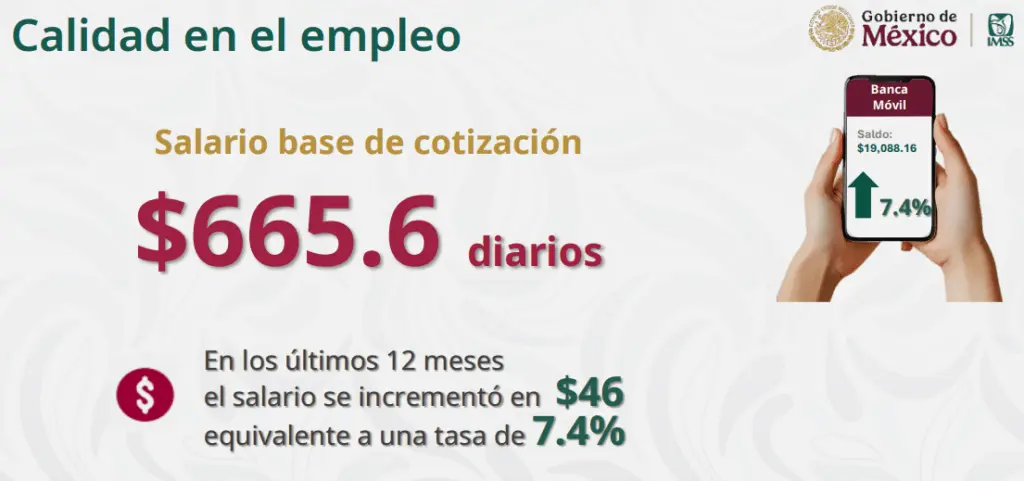 En cuanto a la calidad del empleo, señaló que el salario base de cotización es de 665.6 pesos diarios, en los últimos 12 meses el salario incrementó en 46 pesos.