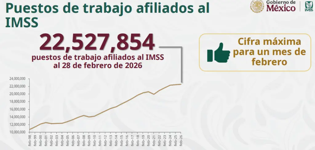 Regeneración, 2 de marzo de 2026. Sheinbaum informó que, al 28 de febrero de 2026, se registraron 22 millones 527 mil 854 puestos de trabajo afiliados al Instituto Mexicano del Seguro Social (IMSS).