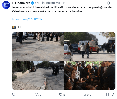 Regeneración, 6 de enero 2026– El ejército israelí ingresó este martes al campus de la Universidad de Birzeit, ubicada en Ramalá, con el fin de disolver una manifestación en apoyo a los presos, lo que resultó en nueve estudiantes heridos de bala, según reportó la Media Luna Roja Palestina.