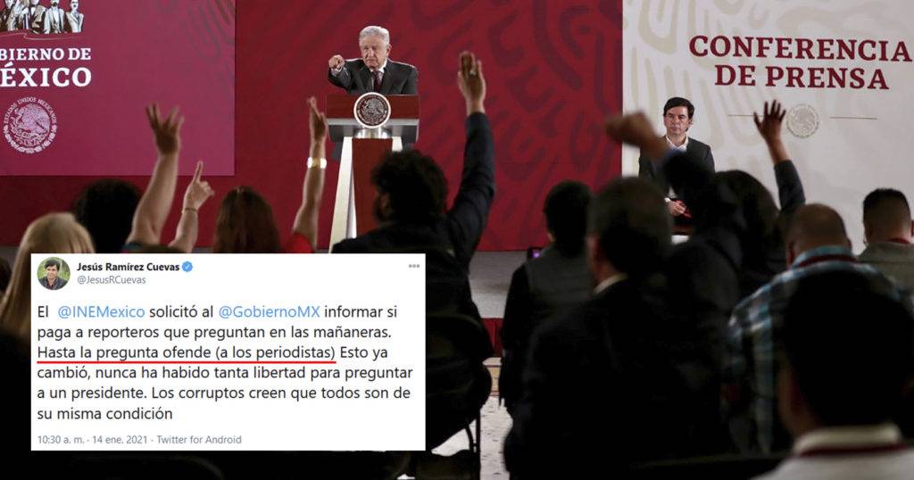 Regeneración, jueves 14 de enero, 2021. El Instituto Nacional Electoral (INE) ofendió a los periodistas que cubren la conferencia matutina del presidente al preguntar si el gobierno les paga por participar. Por Dante García Berlanga, @limpicatto.