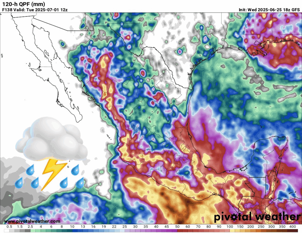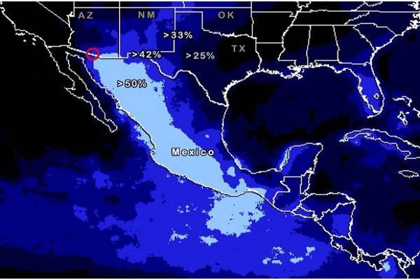 Lo anterior, en regiones de Nayarit; 600 mm en Sinaloa; 300 mm en zonas de Sonora, Durango y Chihuahua, y superiores a 100 mm en Baja California Sur.