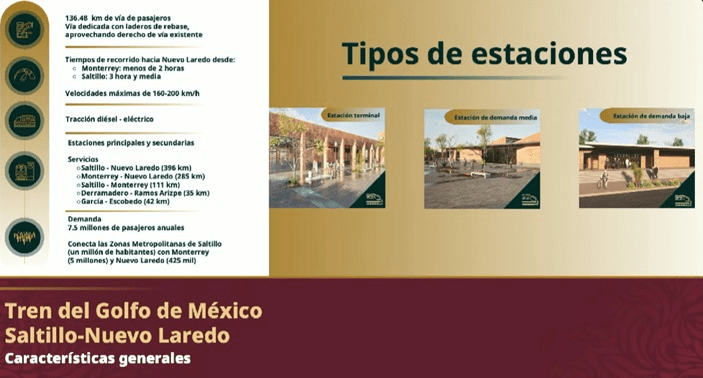 Se subraya que el tren Golfo de México tendrá tiempos de recorrido hacia Nuevo Laredo, de menos de dos horas desde Monterrey, y de tres horas y media desde Saltillo.
