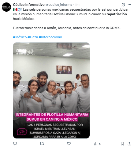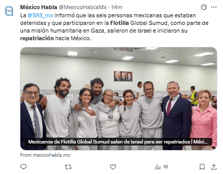 Ellos son de la Flotilla Global Sumud, como parte de una misión humanitaria en Gaza, salieron de Israel e iniciaron su repatriación hacia México.