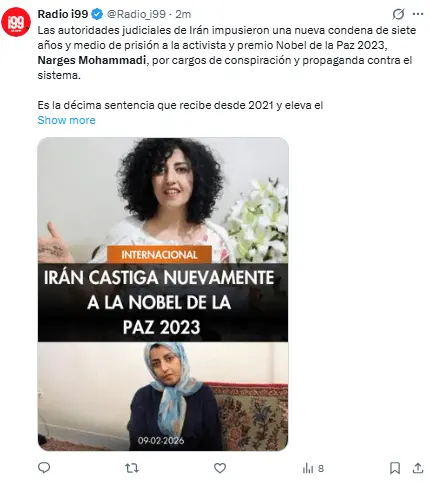 Regeneración, 9 de febrero 2026– Irán ha impuesto a la laureada con el Premio Nobel de la Paz, Narges Mohammadi, más de siete años de cárcel tras iniciar una huelga de hambre ,informaron sus seguidores el domingo.
