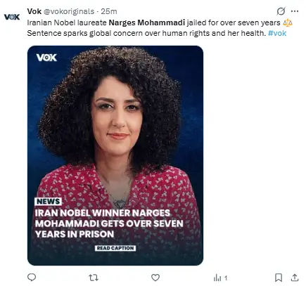 También apoyó las protestas nacionales que surgieron tras la muerte de Mahsa Amini en 2022, las cuales llevaron a muchas mujeres a desafiar abiertamente al gobierno al no usar el hiyab.