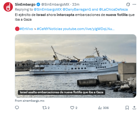 «Tres barcos (Gaza Sunbirds, Alaa al Najjar y Anas al Sharif) han sido atacados e interceptados ilegalmente por el Ejército israelí».