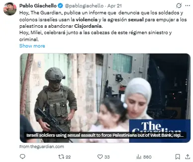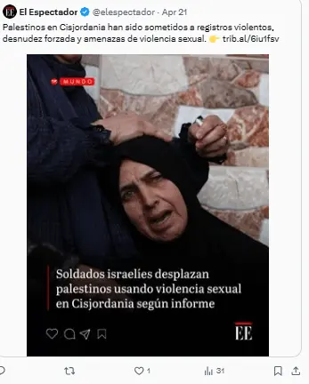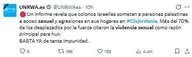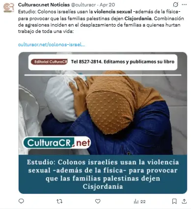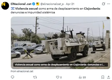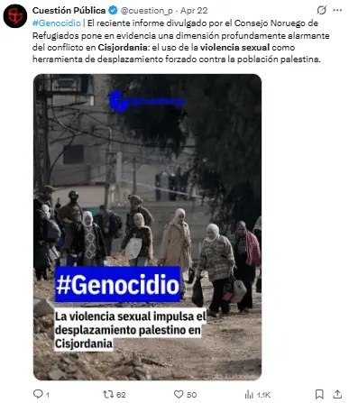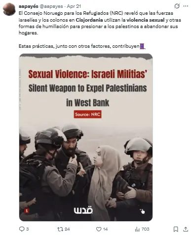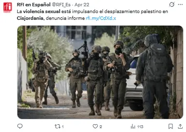 El 20 de abril, el Consorcio para la Protección de Cisjordania publicó un informe titulado «Violencia sexual y traslados forzosos en Cisjordania».
