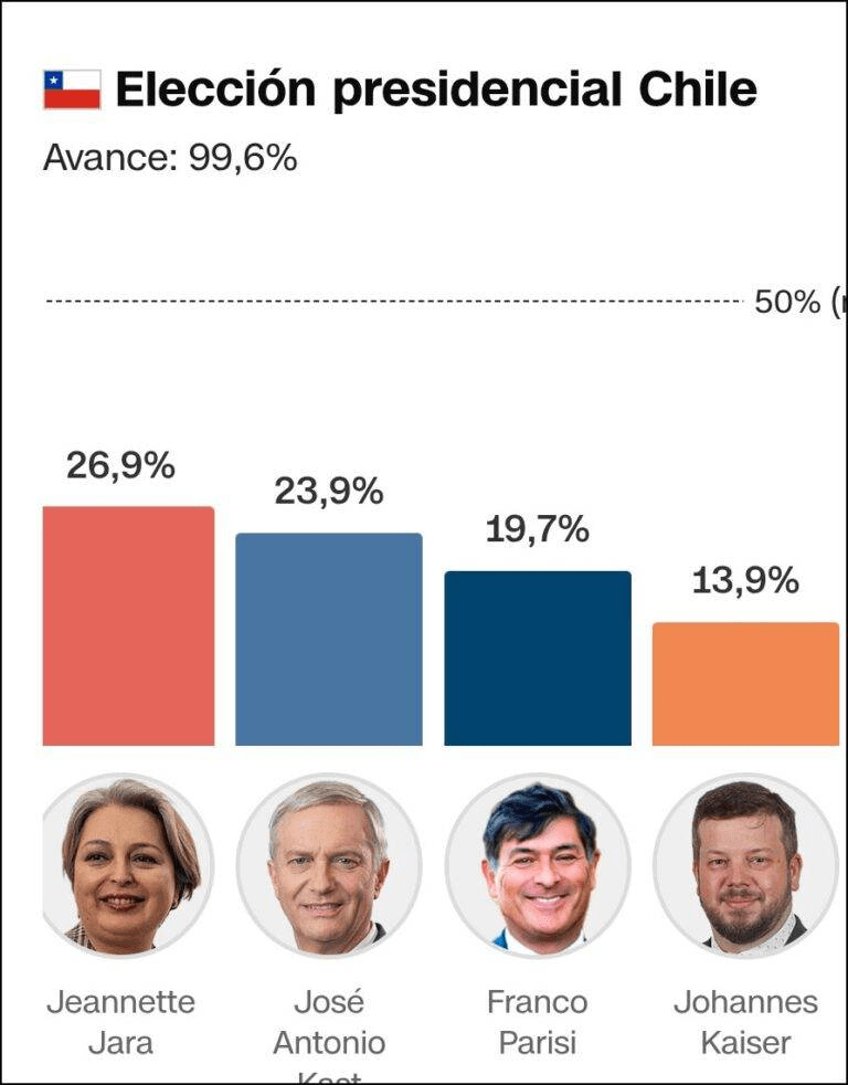 La candidata del Partido Comunista de Chile, Jeannette Jara, obtuvo el 26,85% de los apoyos. En contraste, el abanderado del Partido Republicano, José Antonio Kast, alcanzó el 23,93% de los sufragios.