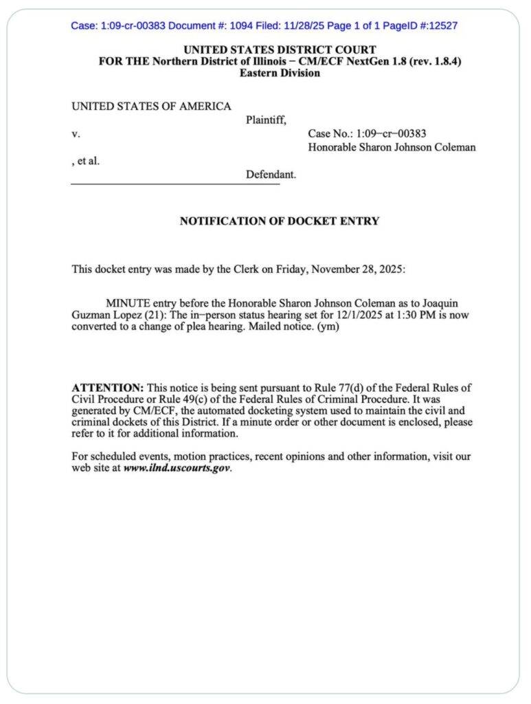 Regeneración, 30 de noviembre de 2025.– Joaquín Guzmán López, hijo de Joaquín “El Chapo” Guzmán, cambiará su declaración. Lo hará el próximo lunes 1 de diciembre en un tribunal de Chicago. Se declarará culpable de varios delitos graves. La audiencia tendrá lugar en la Corte de Distrito para el Norte de Illinois. Será a la 1:30 pm (hora local).