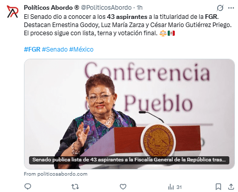 Regeneración, 2 de diciembre 2025– Ernestina Godoy, encargada de la Fiscalía General de la República (FGR), forma parte de la lista de 43 solicitudes válidas registradas por el Senado para la titularidad de la dependencia.
