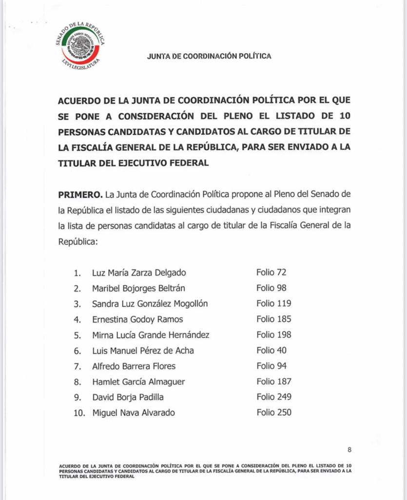 Junta de Coordinación Política del Senado propone a Zarza, Bojorges, González, Godoy, Grande, Pérez, Barrera, García, Borja y Nava