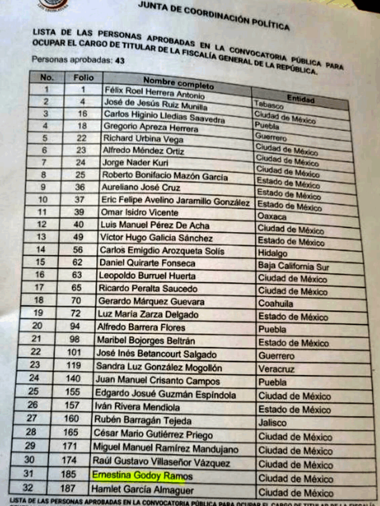 El siguiente paso para la confirmación definitiva del titular de la FGR es que, del total de candidatos, la Junta de Coordinación Política seleccione 10 perfiles.