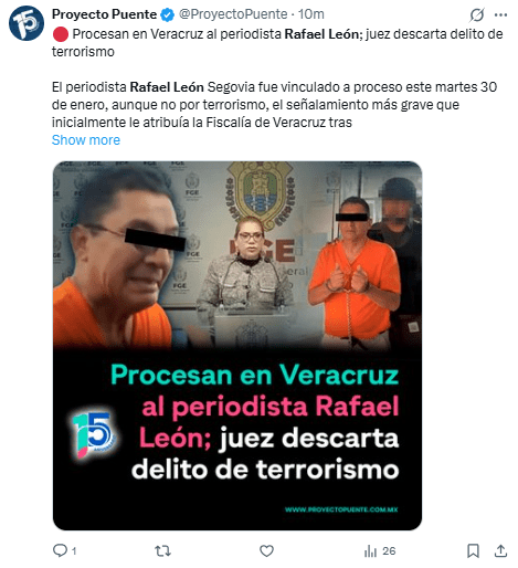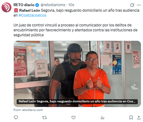 Regeneración, 30 de diciembre de 2025– Un juez en Veracruz desestimó los cargos de terrorismo contra el periodista Rafael León Segovia, conocido como “Lafita León”, y dictó que su proceso se realice con arresto domiciliario por un año.