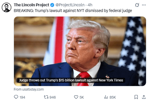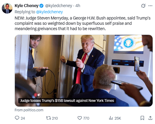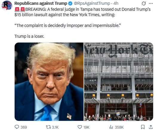 Regeneración, 19 de septiembre 2025– Un juez federal de Florida desestimó la demanda por difamación de 15.000 millones de dólares de Donald Trump contra The New York Times debido a su extensión.