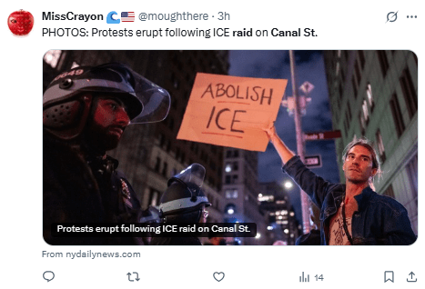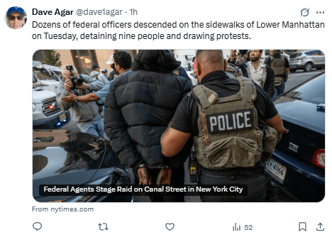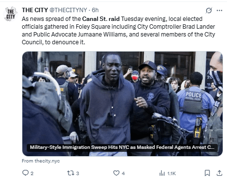 Regeneración, 22 de octubre 2025– Catorce personas fueron detenidas en una operación de control migratorio que provocó protestas espontáneas en Canal Street, Manhattan, informaron el miércoles las autoridades federales.
