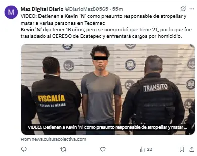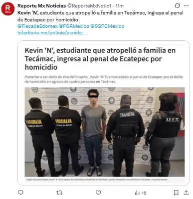 Regeneración, 8 de abril 2026– Después de que un individuo atropellara a varias personas cerca del Hospital General de Zona No. 200 del IMSS en Tecámac, Estado de México, las autoridades anunciaron la aprehensión y encarcelamiento de Kevin “N”, quien es señalado como el culpable de este incidente que resultó en la muerte de cuatro personas y 11 heridos.