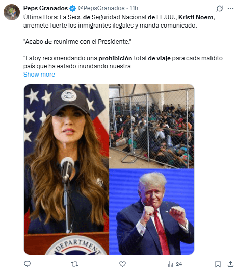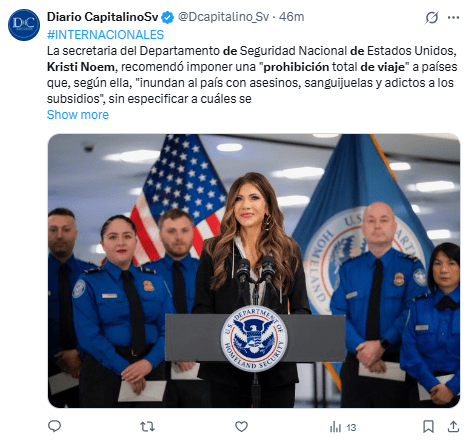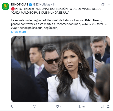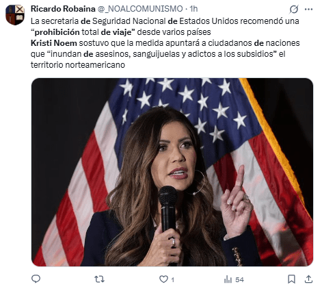 Regeneración, 2 de diciembre 2025– La secretaria de Seguridad Nacional de Estados Unidos, Kristi Noem, ha recomendado una “prohibición total de viaje” desde naciones que “inundan el país de asesinos, sanguijuelas y adictos a los subsidios”, sin especificar a qué naciones se refiere.