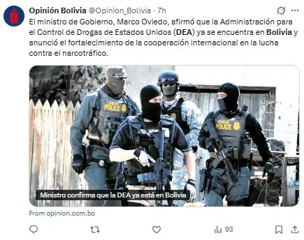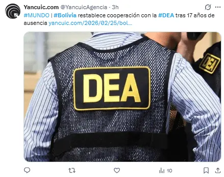Regeneración, 25 de febrero 2026– La Administración para el Control de Drogas de Estados Unidos (DEA) ya colabora con Bolivia en el intercambio de información para combatir el narcotráfico, mientras el gobierno boliviano concluye los detalles de un acuerdo para su regreso tras 18 años.