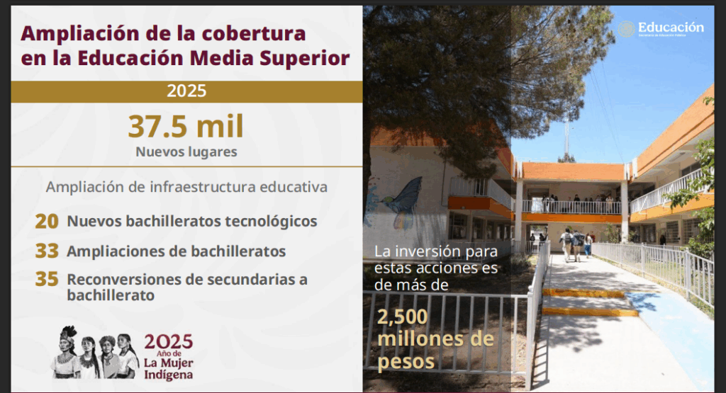Además de que también fortalece este nivel educativo con la ampliación de la cobertura de las preparatorias con 37 mil 500 nuevos espacios.