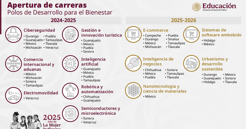 Además, en el marco del Plan México se planea una nueva oferta educativa en función de las necesidades del país para dar un impulso a los Polos de Desarrollo.
