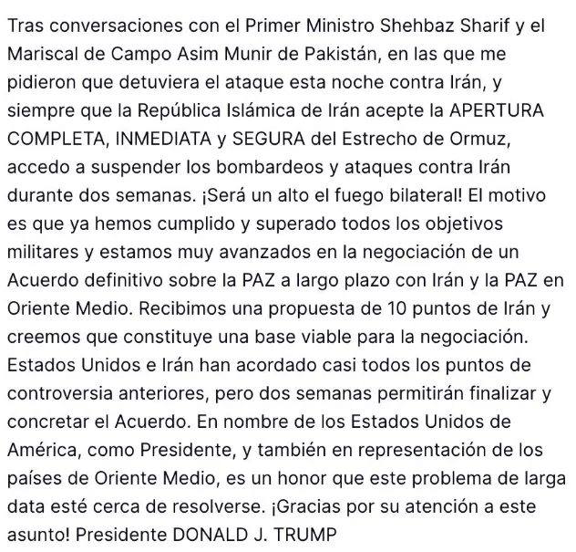 «Acabo de recibir una propuesta de 10 puntos de Irán que es una base viable para una paz duradera. Casi todos los puntos de discordia del pasado han sido acordados. Debido a esto, y tras hablar con el Primer Ministro Sharif de Pakistán, he ordenado una suspensión de14 días de todas las operaciones ofensivas.»