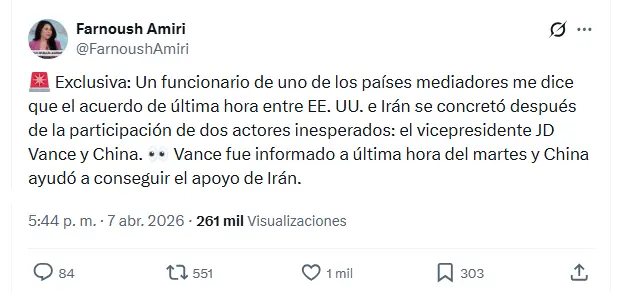 El Consejo de Seguridad Nacional de Irán confirmó la madrugada del miércoles el alto el fuego con Estados Unidos de dos semanas, durante las cuales negociarán un acuerdo de paz en Islamabad, la capital de Pakistán, con base a un plan de diez puntos presentado por Teherán.
