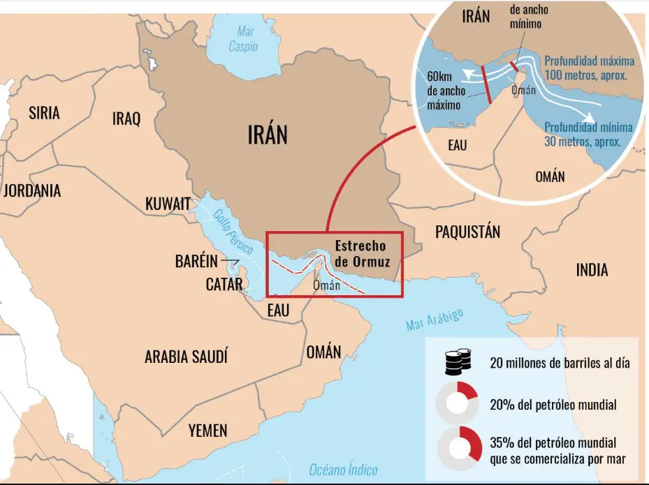 1-El paso controlado por el Estrecho de Ormuz, coordinado con las fuerzas armadas iraníes, otorgando a Irán un papel económico y geopolítico decisivo en el estrecho.
