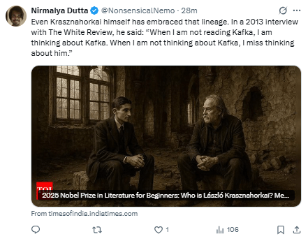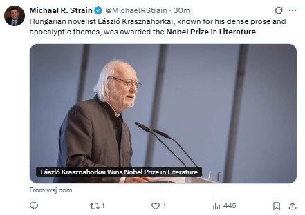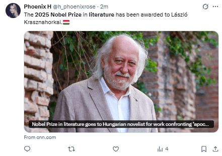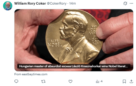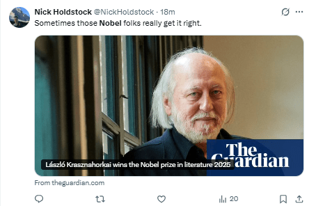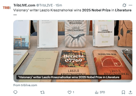 Regeneración, 9 de octubre 2025– La Academia sueca otorgó el Premio Nobel de Literatura al escritor y guionista húngaro László Krasznahorkai. Considerado por muchos como el autor vivo más importante de Hungría, sus obras exploran temas como la distopía posmoderna y la melancolía.