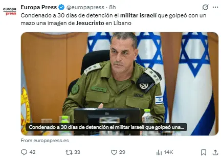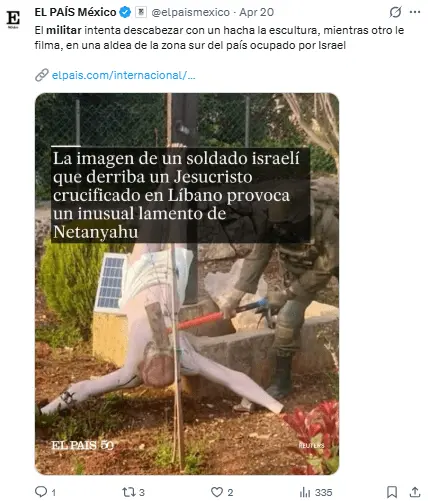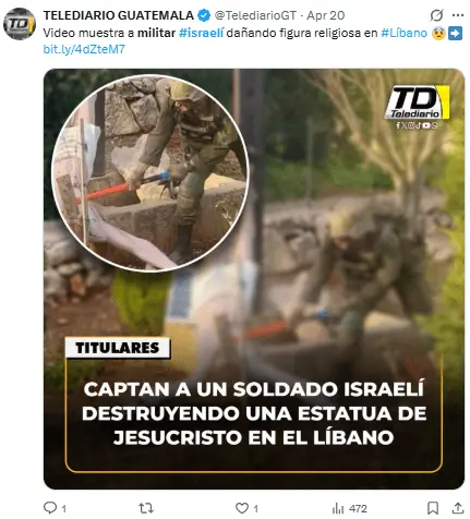 Regeneración, 21 de abril 2026– La imagen de un militar israelí utilizando un martillo para dañar una figura de Jesucristo en el sur del Líbano ha suscitado múltiples críticas, en un hecho por el que el primer ministro israelí prometió «acciones severas».