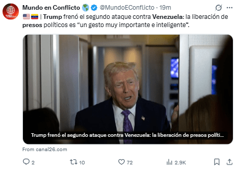 Regeneración, 9 de enero 2026– El presidente Donald Trump comunicó que ha detenido una segunda serie de ataques planeados contra Venezuela, tras lo que definió como un «movimiento muy esencial e inteligente» del nuevo gobierno venezolano, dirigido por Delcy Rodríguez.