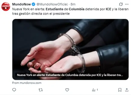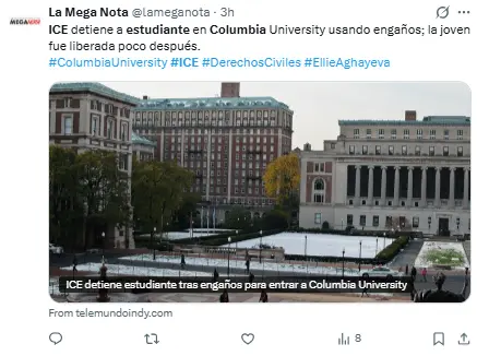 Regeneración, 27 de febrero 2026– Ellie Aghayeva, estudiante de la Universidad de Columbia y que fue detenida el jueves por agentes del Departamento de Seguridad Nacional (DHS), fue liberada, tal como ella misma confirmó en su cuenta de Instagram.
