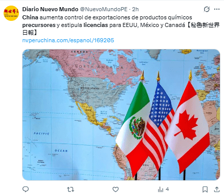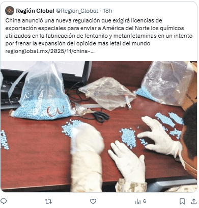 Regeneración, 11 de noviembre 2025– China anunció este lunes que Estados Unidos, México y Canadá deberán contar con licencias de exportación especiales para 13 precursores químicos del fentanilo y la metanfetamina.