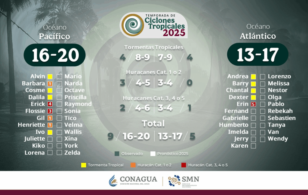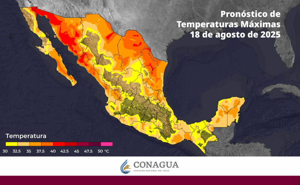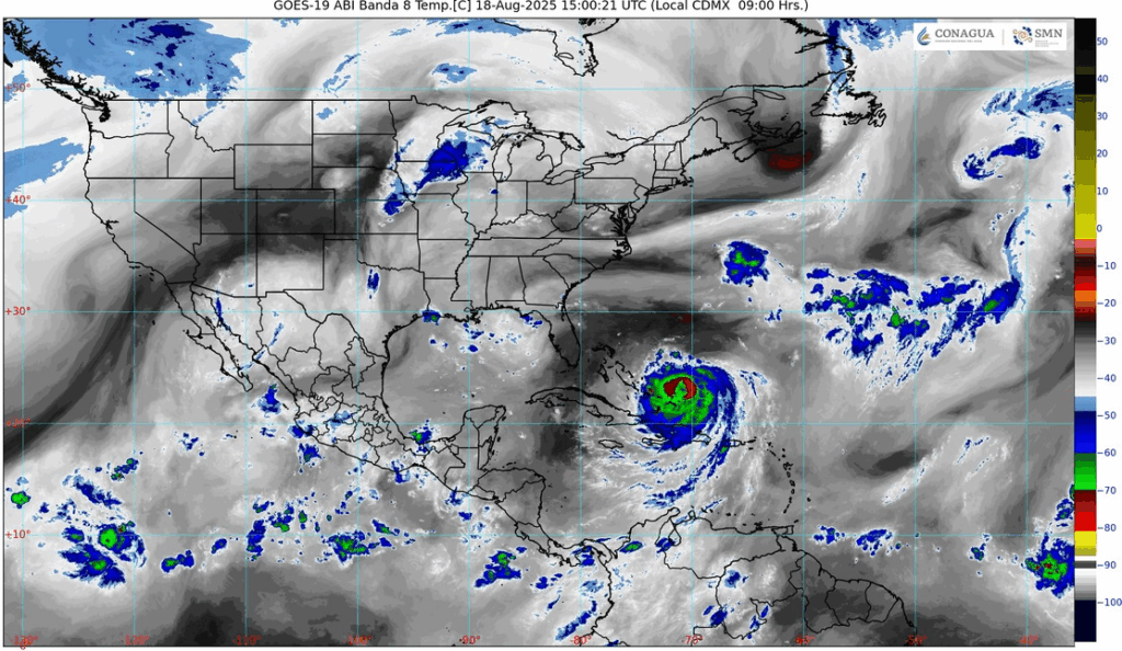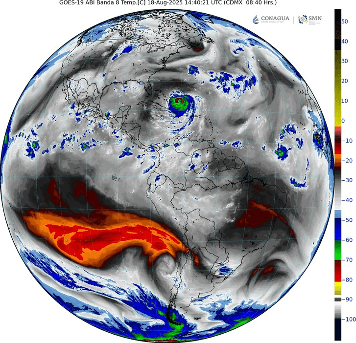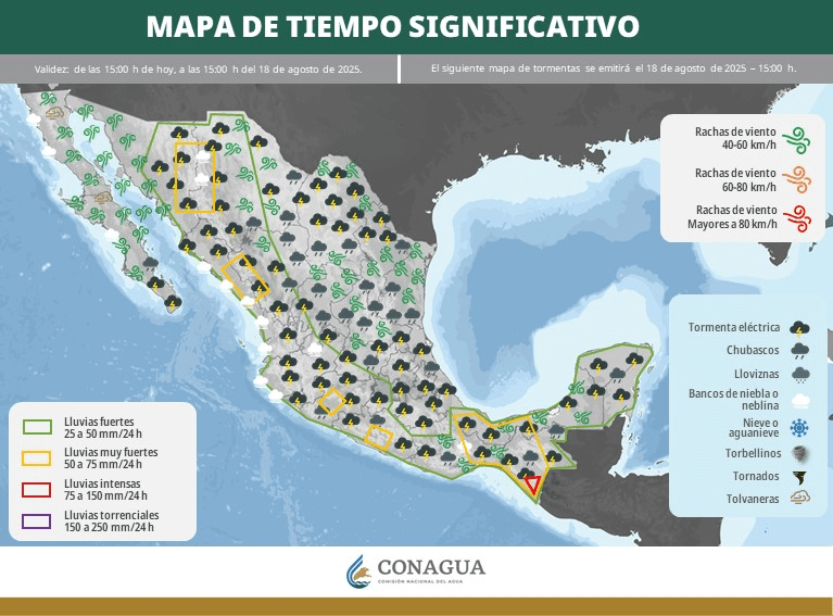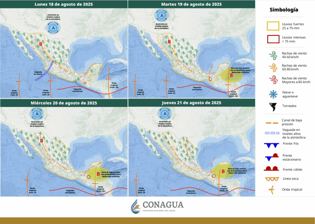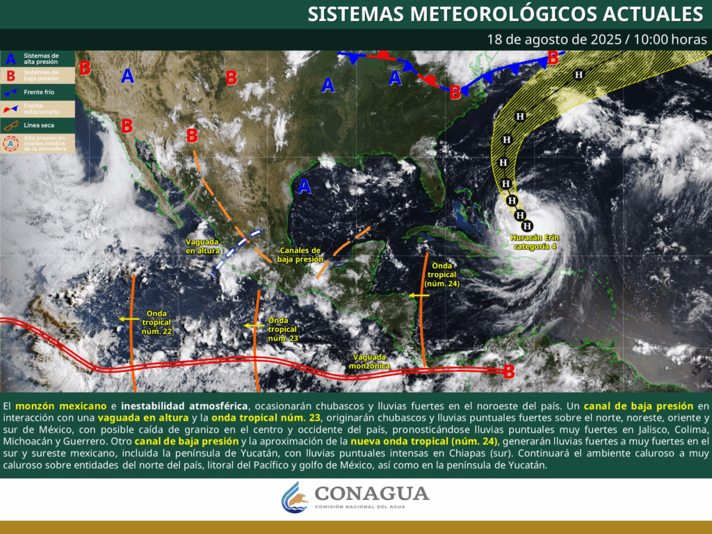 Regeneración, 18 de agosto de 2025. Este día, el monzón mexicano e inestabilidad atmosférica, ocasionarán chubascos en Baja California Sur y lluvias fuertes en Sonora, Chihuahua, Durango, Sinaloa y Nayarit.