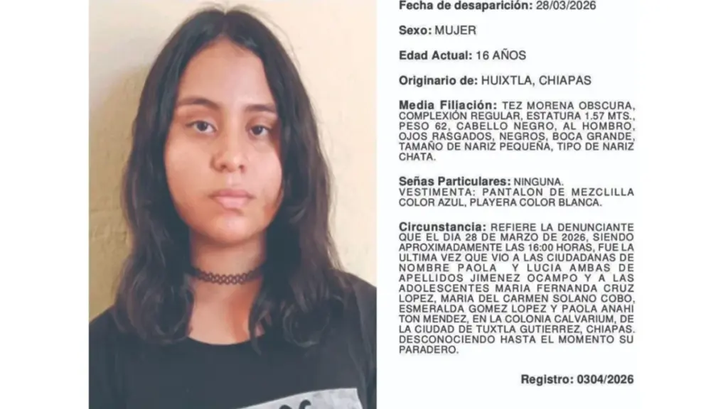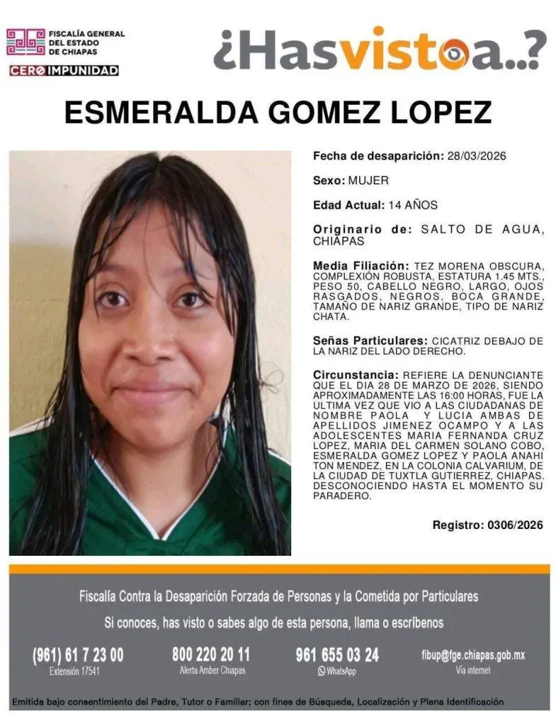 Se trata de María Fernanda Cruz López, de 16 años, quien es originaria de la ciudad de Huixtla. También se busca a Esmeralda Gómez López, de 14 años, oriunda de la localidad de Salto de Agua.