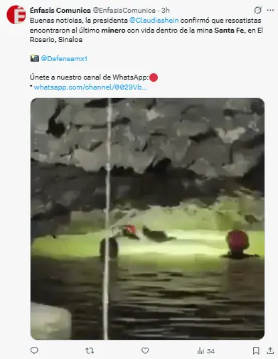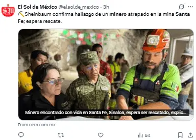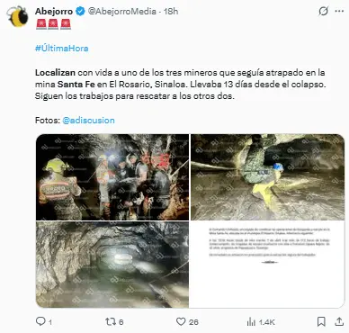 Regeneración, 8 de abril 2026– La presidenta Claudia Sheinbaum anunció este miércoles 8 de abril que el último minero atrapado en la mina Santa Fe, localizada en El Rosario, Sinaloa, fue encontrado con signos vitales después de haber estado 13 días bajo tierra, aunque hasta ahora no ha podido ser rescatado.