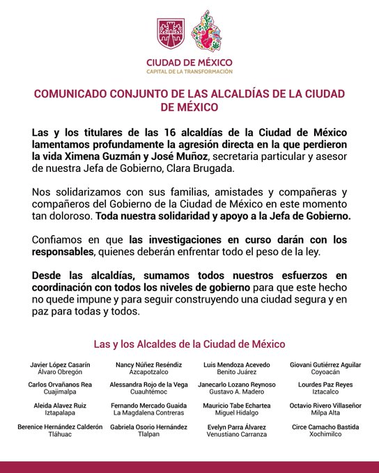 “Desde el gobierno de México enviamos condolencias a sus familiares; todo el apoyo que requiera la jefa de Gobierno. Vamos a llegar al fondo de esta situación y que haya justicia.