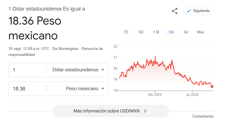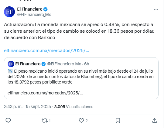 Regeneración, 15 de septiembre de 2025. En redes destacan que el peso mexicano ligó su séptima jornada consecutiva de ganancias.