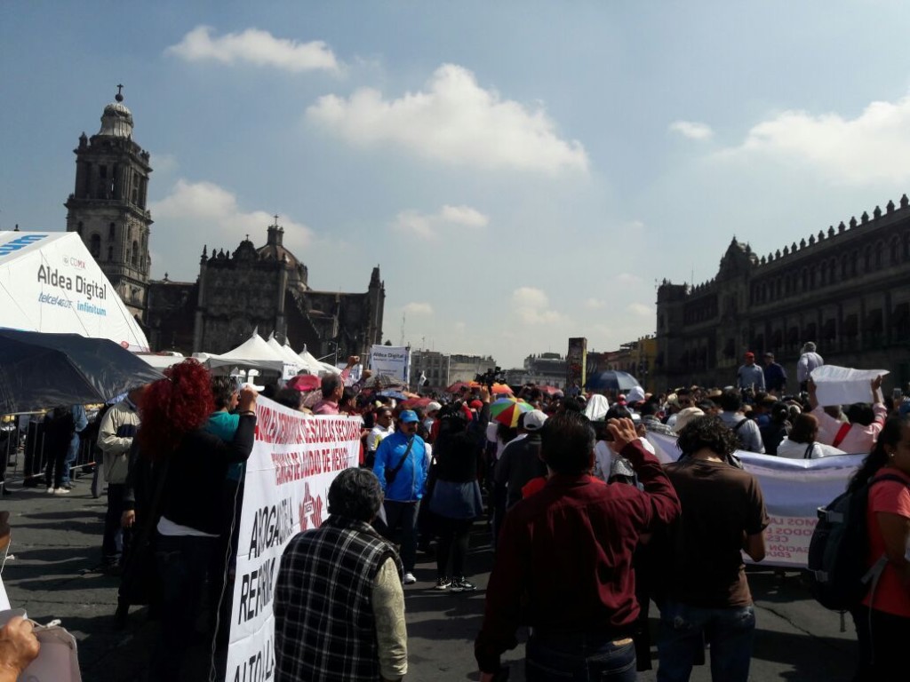 En operación hormiga, educadores se concentraron a unos pasos de la plancha central de la Plaza de la Constitución, donde se ubica la Aldea Digital, sin que se impida el acceso a los visitantes. El gobierno de Miguel Ángel Mancera decidió cerrar la estación de Metro Zócalo para evitar que más docentes llegaran.