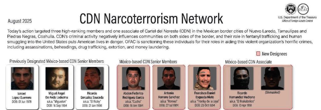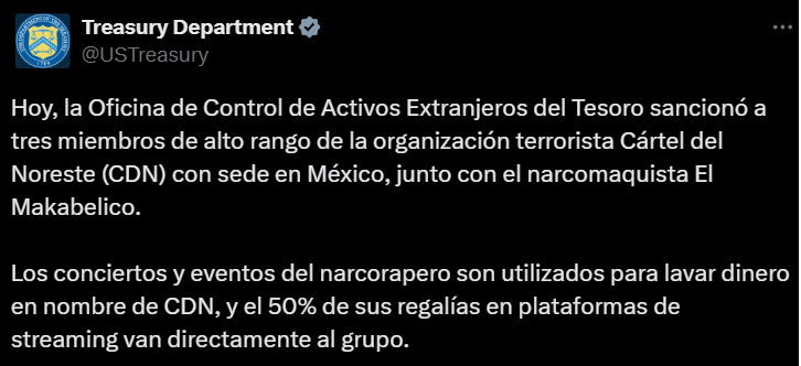 Regeneración, 6 de agosto de 2025. En redes destacan que el Departamento del Tesoro de EE.UU informó de sanciones a los activos de 4 personas ligadas presuntamente al Cártel del Noreste.