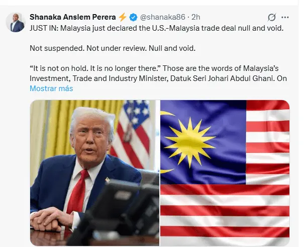 Regeneración, 16 de marzo de 2026. El ministro malasio de inversión, comercio e industria, Johari Ghani, reveló que el Acuerdo Comercia Recíproco -ART- con EE.UU ahora es nulo y sin efecto.