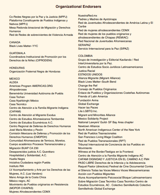 Entre ellos las Co-Redes Negras por la Paz y la Justicia (MPPJ), Plataforma Constituyente de Pueblos Indígenas y Nativos (MPPJ); Mesa Redonda binacional de Migración y Derechos Humanos.