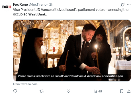 Al final de su viaje a Israel, J. D. Vance dijo: «Si fue una maniobra política, fue una maniobra política muy estúpida y, personalmente, me siento insultado».