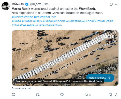 Regeneración, 23 de octubre 2025– El secretario de Estado de Estados Unidos Marco Rubio dijo que una iniciativa del parlamento israelí para anexar la Cisjordania ocupada amenazaría el plan de Washington de poner fin al conflicto en Gaza.